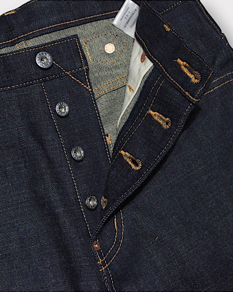 フロントフライのボタンホールを貫通、ステッチの交差。
