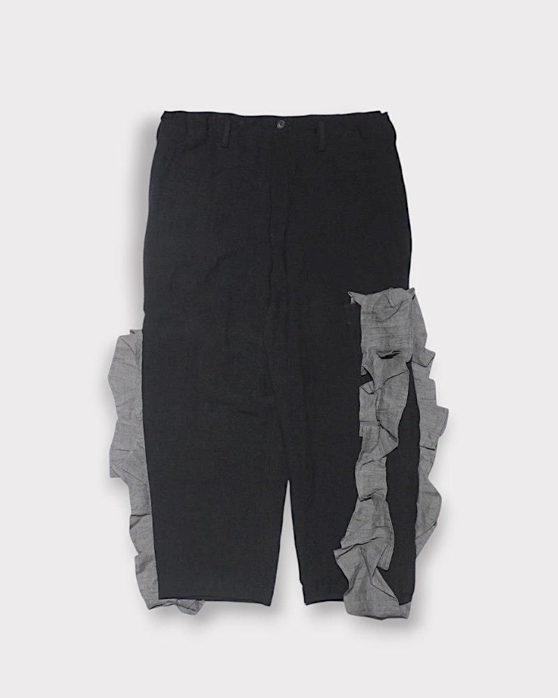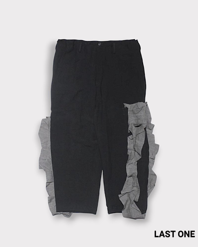 Yohji Yamamoto POUR HOMME S/S 2024 COLLECTION LOOK26で登場し、レーヨンリネンのキャンバス素材を使用したフリル付きウエスト紐パンツ。