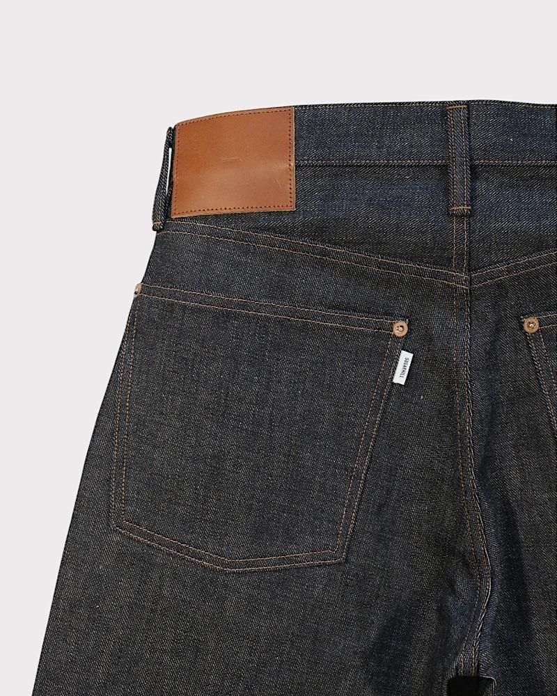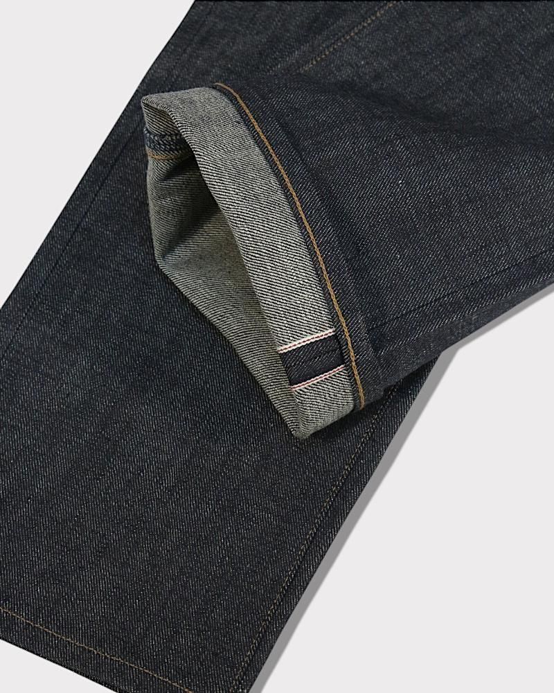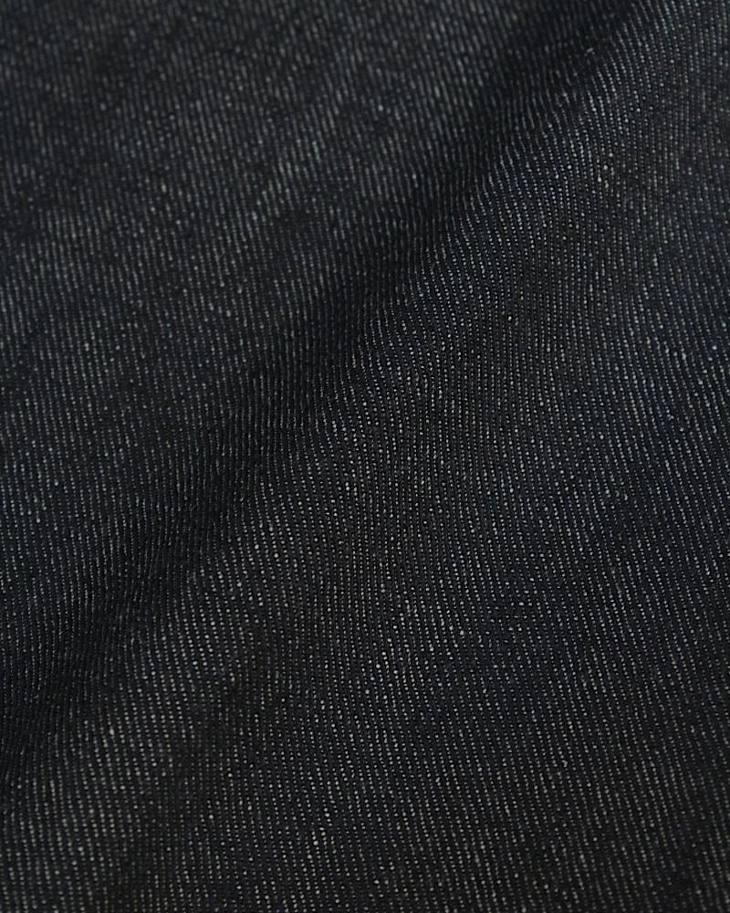 一般的なデニム生地はインディゴ染色した縦糸と、染色加工を施さない生成色の緯糸を用いて織られますが、ライトベージュに染めた緯糸を打ち込むことで、色の交わりに深みを演出しています。